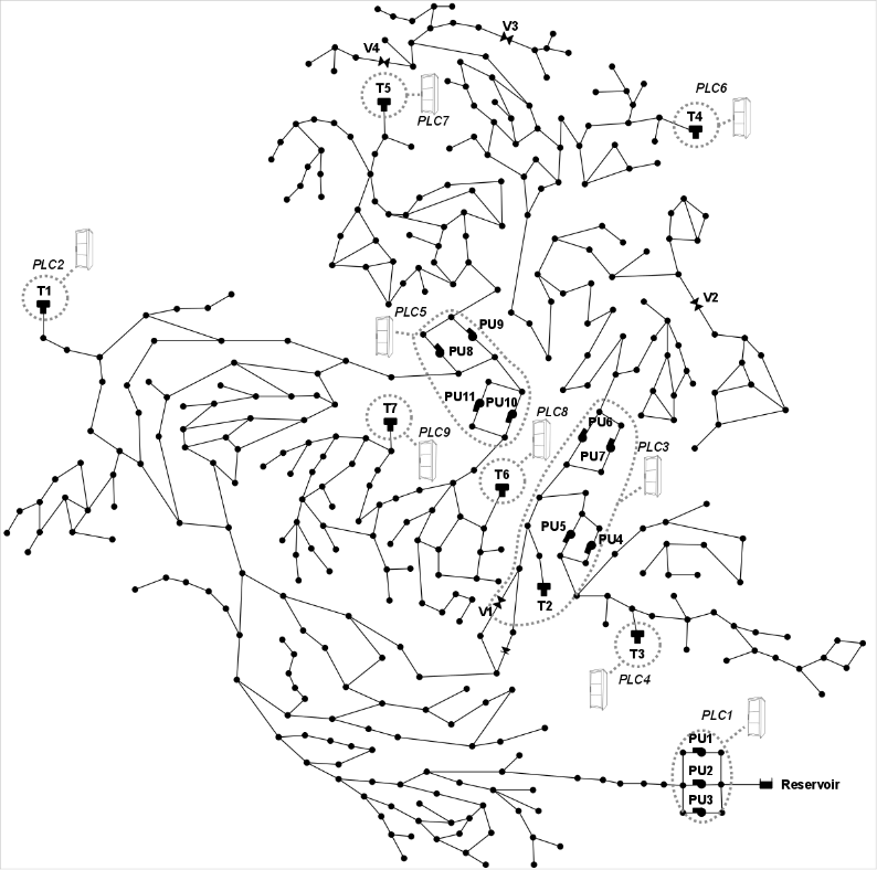 The Calibration Network system serves the hypothetical town C-Town and was created by Avi Ostfield et al. in 2011 as part of the Battle of the Water Calibration Networks (BWCN) competition. The C-Town network was also used susequent competitions such as the BATADAL competition and BBLAWN competition.